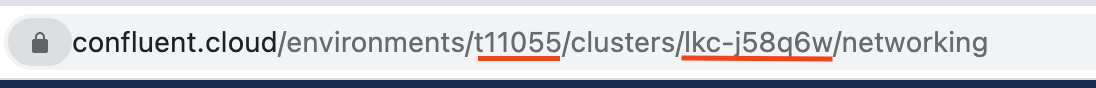 Or you can log in to the Confluent Cloud dashboard, select your cluster and find the IDs in the URL bar: