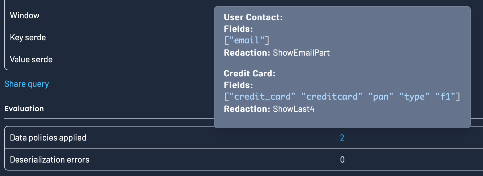 If you have any Data policies that apply to the query that was executed, the Show context section will show you what policies matches your queries, and the redactions applied.